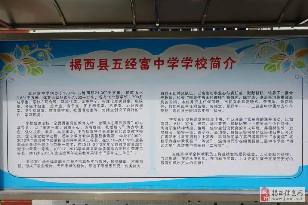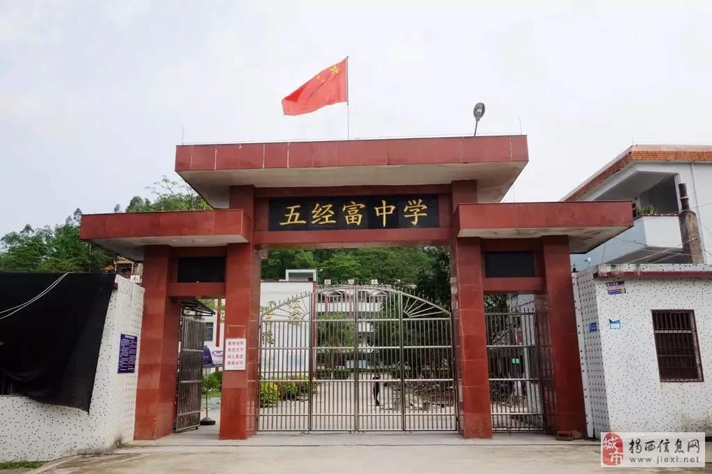 五经富中学创办于1987年,占地面积21,000平方米,学校布局合理,环境优美,设施齐全,为师生创设了良好的工作、学习环境。学校为办学理念,强化校风、教风、学风建设,不断探索符合素质教育的课堂教学模式,优化课堂教学过程。近年来教育教学质量稳步提高。