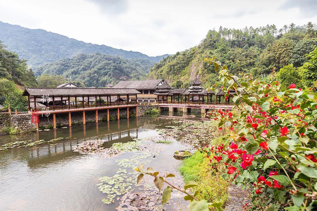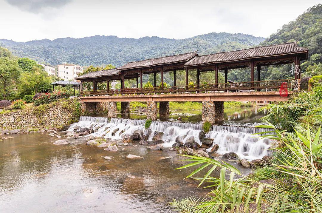 相比起瀑布的自然、狂野,这里显得岁月静好了许多。 长长的风雨桥架在水面之上,古朴的檐角指向天空。背后的群山被绿色掩映,就像披盖了一层毛茸茸的毯子。