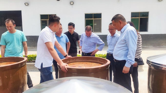 图为元合酱油第四代传承人——曾维民正在为镇长等领导介绍酱油制作过程